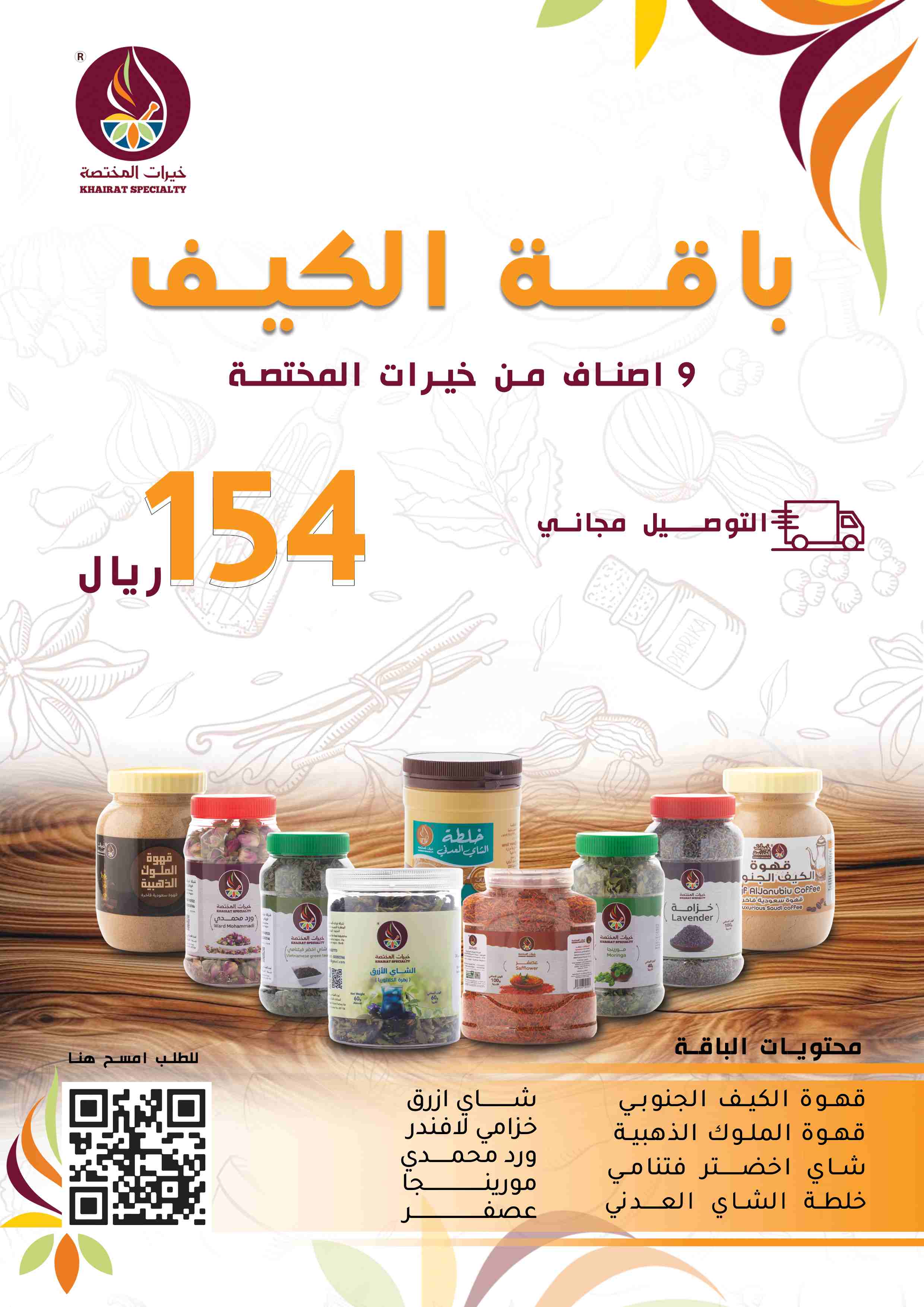 باقة الكيف: رحلة عبر عالم النكهات والاسترخاء!السعــــــــــر: 154 ريالهل تبحث عن تجربة استثنائية تُنعش روحك وتُهدئ جسدك؟مع باقة الكيف، ستجد ملاذك الآمن في عالم من النكهات المُتنوعة والروائح العطرة التي تُعيد لك نشاطك وتُضفي على يومك راحة لا مثيل لها!محتــويـــــات الباقــــــــــــــــــة:1. قهوة الكيف الجنوبي:الوصف: مزيج فريد من حبوب البن العربية عالية الجودة مع لمسة من التوابلالجنوبية لإضفاء نكهة غنية وقوية تُوقظ حواسك وتُنعش يومك.الفوائد: تُضفي نكهة تقليدية مميزة مع لمسة جنوبية مُنعشة.تُساعد على التركيز وتحسين الإنتاجية.تُضفي رائحة فواحة تُثير الشهية.تُناسب جميع أنواع القهوة.تُضفي قيمة غذائية عالية بفضل المكونات الطبيعية عالية الجودة.2. قهوة الملوك الذهبية:الوصف: مزيج فاخر من حبوب البن المحمصة بدقة لإضفاء نكهة غنية ونكهةمميزة على قهوتك، تُضفي عليها لمسة ملكية تُبهر جميع الضيوف.الفوائد: تُضفي نكهة تقليدية مميزة مع لمسة عصرية فاخرة.تُكسب قهوتك لونًا ذهبيًا مُبهرًا يدل على جودة المكونات وفخامة الطبق.تُضفي رائحة فواحة تُثير الشهية وتجذب الأنظار.تُناسب جميع أنواع القهوة.تُضفي قيمة غذائية عالية بفضل المكونات الطبيعية عالية الجودة.3. شاي أخضر فيتنامي:الوصف: شاي أخضر عضوي من أجود أنواع أوراق الشاي الفيتنامي، غنيبمضادات الأكسدة وله فوائد صحية مُتنوعة.الفوائد:يُساعد على تحسين الهضم وزيادة حرق الدهون.يُقوي جهاز المناعة ويُحارب الشيخوخة.يُساعد على الاسترخاء وتحسين جودة النوم.يُناسب جميع الأوقات.يُمكن إضافة النكهات المُفضلة إليه مثل الليمون أو النعناع.4. خلطه الشاي العدني:الوصف: مزيج تقليدي من الأعشاب اليمنية لإضفاء نكهة مميزة على شايالأعشاب، غني بالفوائد الصحية ويُساعد على الاسترخاء.الفوائد: يُساعد على تحسين الهضم والمساعدة في التخلص من الانتفاخ.يُهدئ الجهاز العصبي ويُساعد على الاسترخاء والنوم.يُقوي جهاز المناعة ويُحارب الأمراض.يُناسب جميع الأوقات.يُمكن إضافة النكهات المُفضلة إليه مثل الزنجبيل أو العسل.5. شاي ازرق:الوصف: شاي أزرق عضوي من أجود أنواع أوراق الشاي، غني بمضادات الأكسدة.الفوائد: يُساعد على تحسين صحة القلب والوقاية من أمراض القلب.يُقوي جهاز المناعة ويُحارب الشيخوخة.يُساعد على تحسين الذاكرة والتركيز.يُناسب جميع الأوقات.يُمكن إضافة النكهات المُفضلة إليه مثل الليمون أو النعناع.6. خزامى لافندر:الوصف: زهور الخزامى المجففة لإضفاء رائحة عطرة على منزلك،تُساعد على الاسترخاء وتحسين جودة النوم.الفوائد: تُضفي رائحة هادئة ومُريحة على المنزل.تُساعد على الاسترخاء والتخلص من التوتر والقلق.تُحسّن من جودة النوم.تُناسب جميع الأوقات، من الصباح إلى المساء.يُمكن استخدامها في صنع أكياس النوم أو بخاخات الغرفة.تُقلل من آلام الصداع.تُحسّن من صحة البشرة.7. ورد محمدي:الوصف: زهور الورد المجففة لإضفاء نكهة مميزة على الحلويات والمشروبات،غنية بالفوائد الصحية وتُساعد على الاسترخاء.الفوائد:يُضفي نكهة تقليدية مميزة على الحلويات والمشروبات.يُهدئ الجهاز العصبي ويُساعد على الاسترخاء والنوم.يُقوي جهاز المناعة ويُحارب الأمراض.يُناسب جميع الأوقات، من الصباح إلى المساء.يُمكن إضافة النكهات المُفضلة إليه مثل العسل أو الليمون.8 مورينجا:الوصف: مسحوق أوراق المور ينجا العضوية، غني بالفيتامينات والمعادنومضادات الأكسدة وله فوائد صحية مُتنوعة.الفوائد:يُساعد على تحسين الهضم وزيادة حرق الدهون.يُقوي جهاز المناعة ويُحارب الشيخوخة.يُساعد على خفض ضغط الدم.يُناسب جميع الأوقات، من الصباح إلى المساء.يُمكن إضافة النكهات المُفضلة إليه مثل العسل أو الليمون.يُقلل من خطر الإصابة بالسرطان.يُحسّن من صحة البشرة.يُساعد على الوقاية من أمراض القلب.يُعزز صحة الدماغ.يُحسّن من وظائف الكبد.9. عصفر:الوصف: زهور العصفر المجففة لإضفاء نكهة مميزة على الأطباق والحلويات،غنية بالفوائد الصحية وتُسا