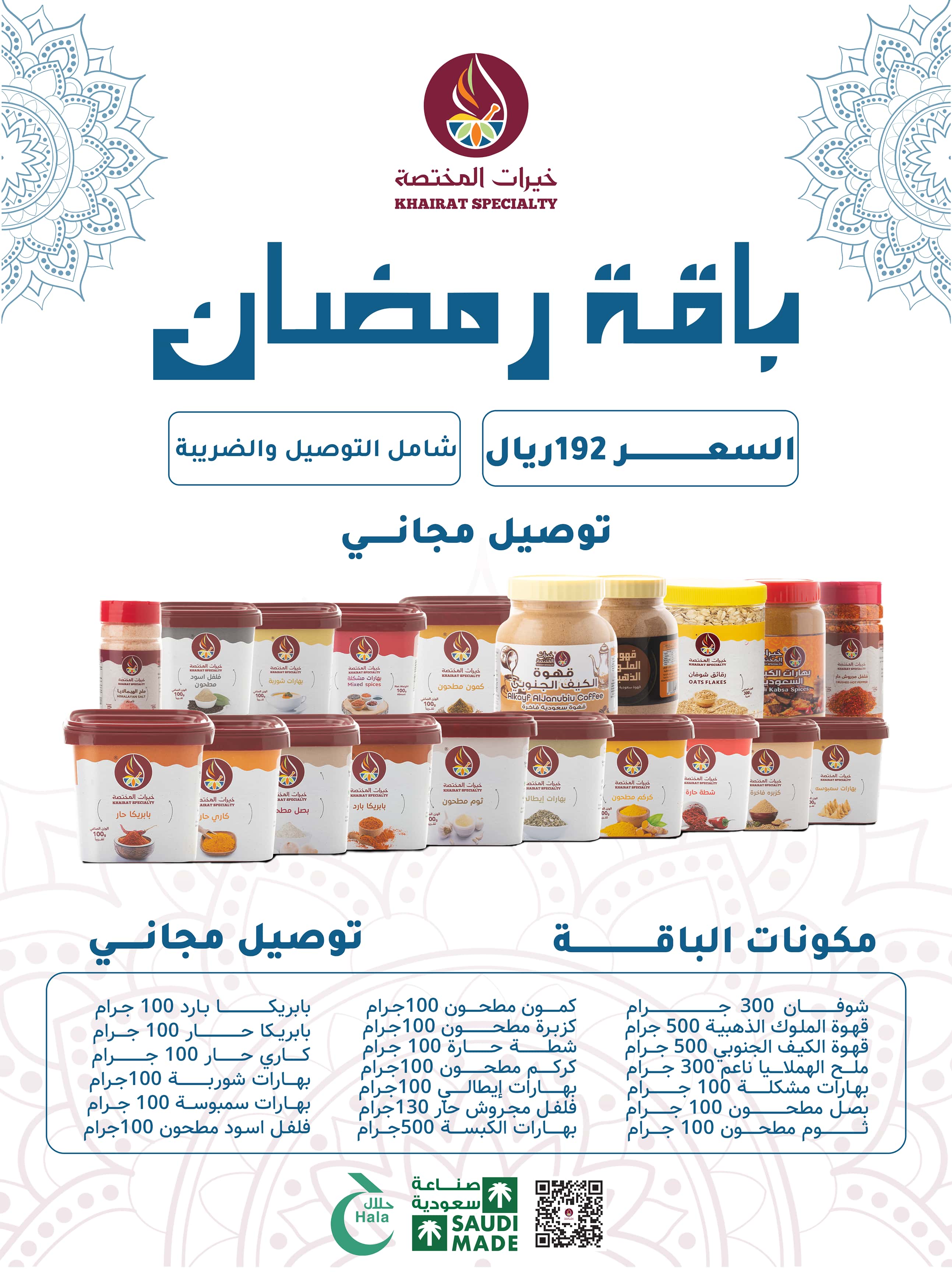 من خيرات المختصة، حيث نوفر لك مجموعة متنوعة من أجود المنتجات الطبيعية والتوابل الفاخرة التي تضيف نكهة غنية لأطباقك اليومية. تم اختيار كل منتج بعناية لضمان الجودة والطعم الأصيل، مما يجعل الطهي أكثر متعة وسهولة خلال الشهر الفضيل.